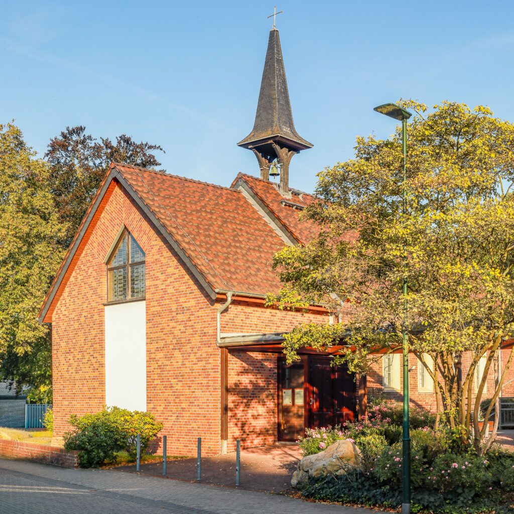 Die Lukaskirche mit dem Gemeindezentrum in Kerpen-Brüggen, Kirchweg 7-9